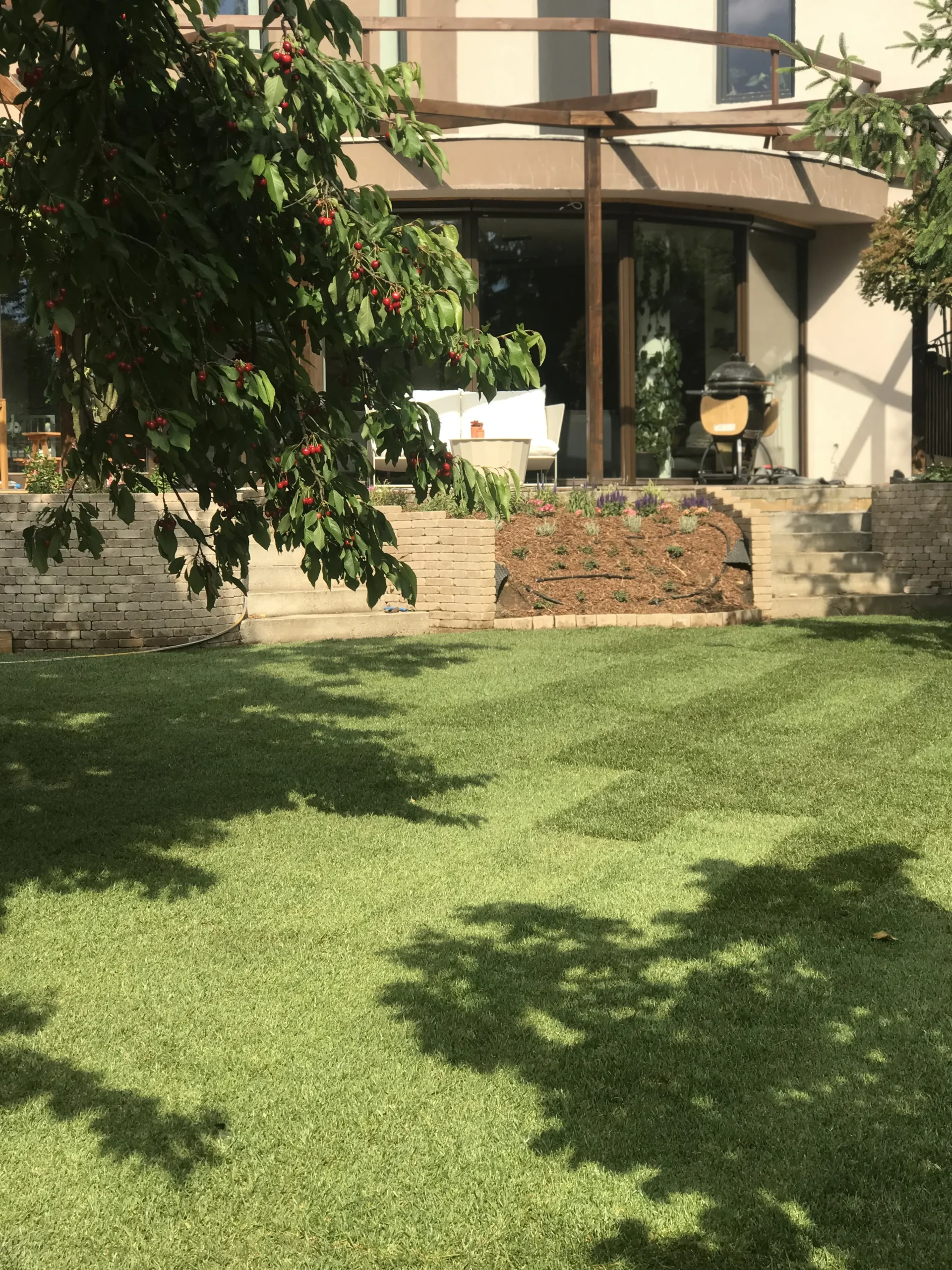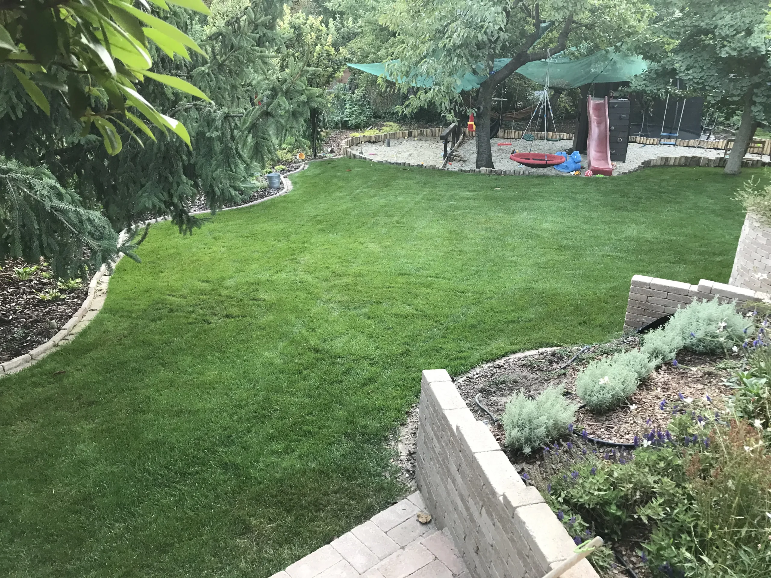A kertfenntartás a mi feladatunk, így a kivitelezés befejezése óta is rendszeresen visszatérünk, hogy ápoljuk, formáljuk, sőt, bővítsük is a kertet – mindig a család aktuális élethelyzeteihez és igényeihez igazodva. A telepített automata öntözőrendszer biztosítja, hogy a növények és a gyep megfelelő vízellátása automatikusan, megbízhatóan történjen – időt spórolva, miközben megőrzi a kert frissességét.