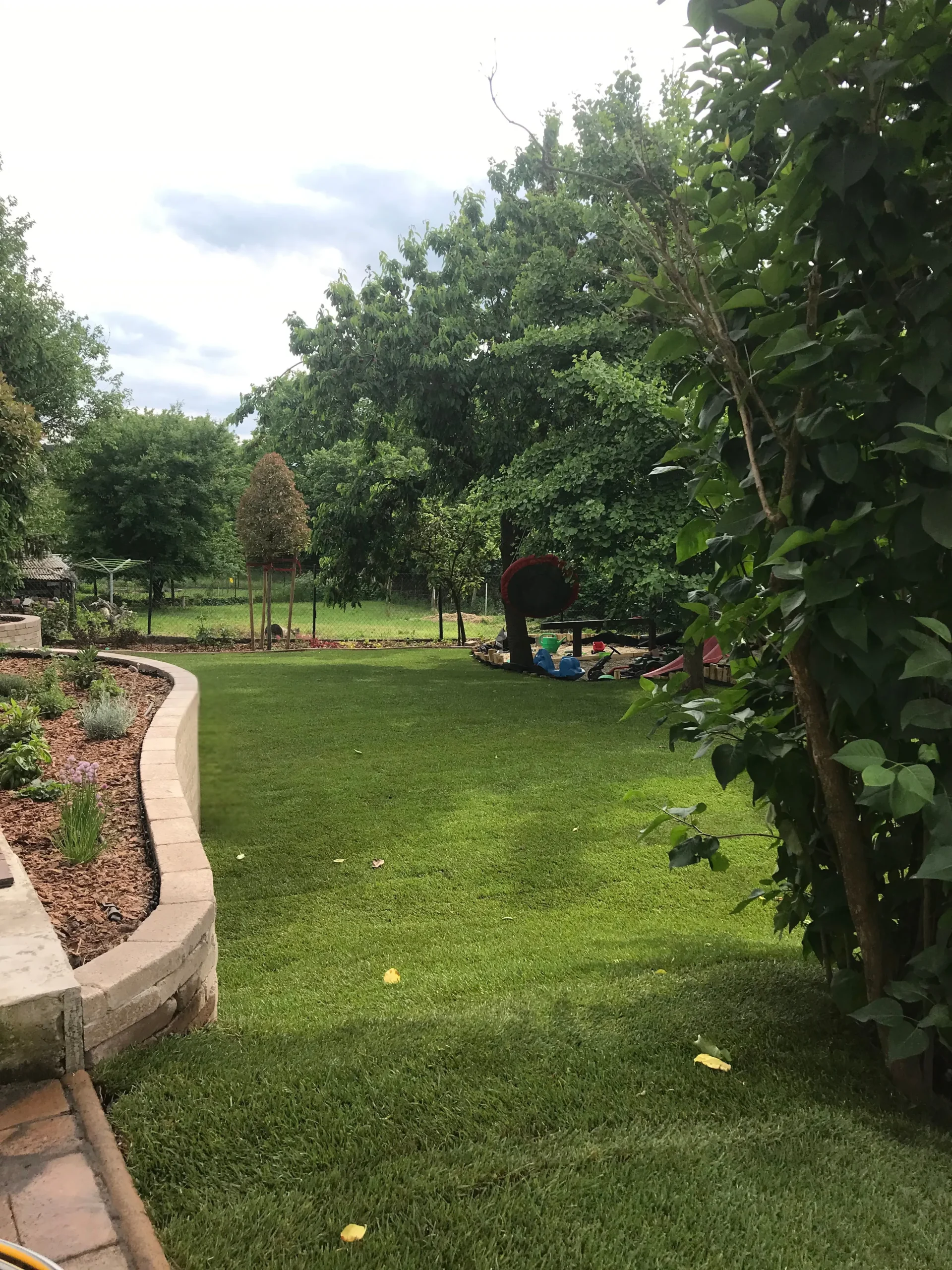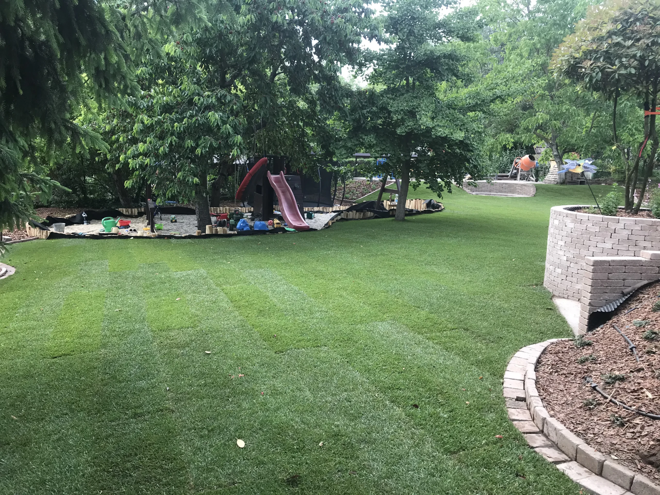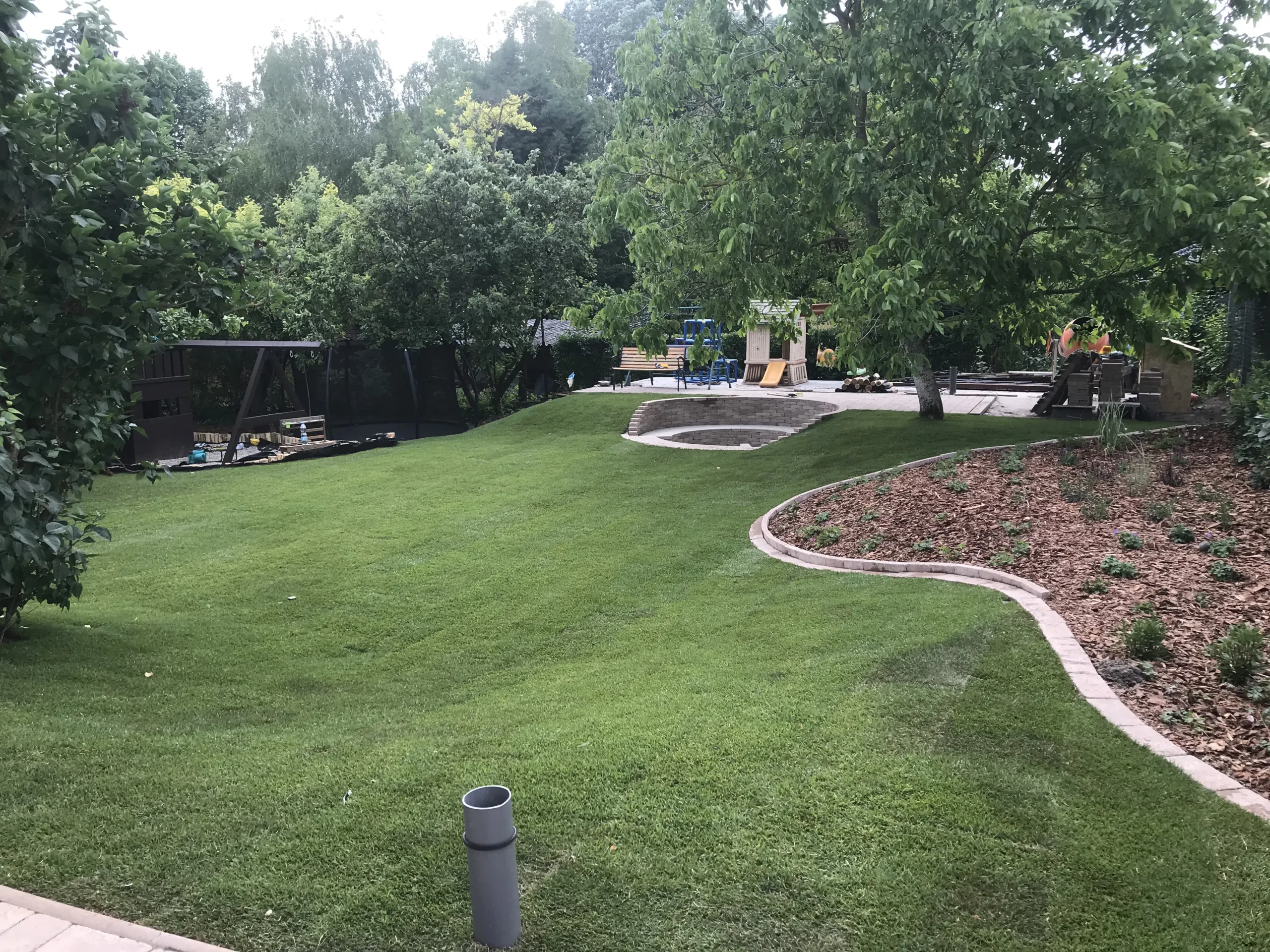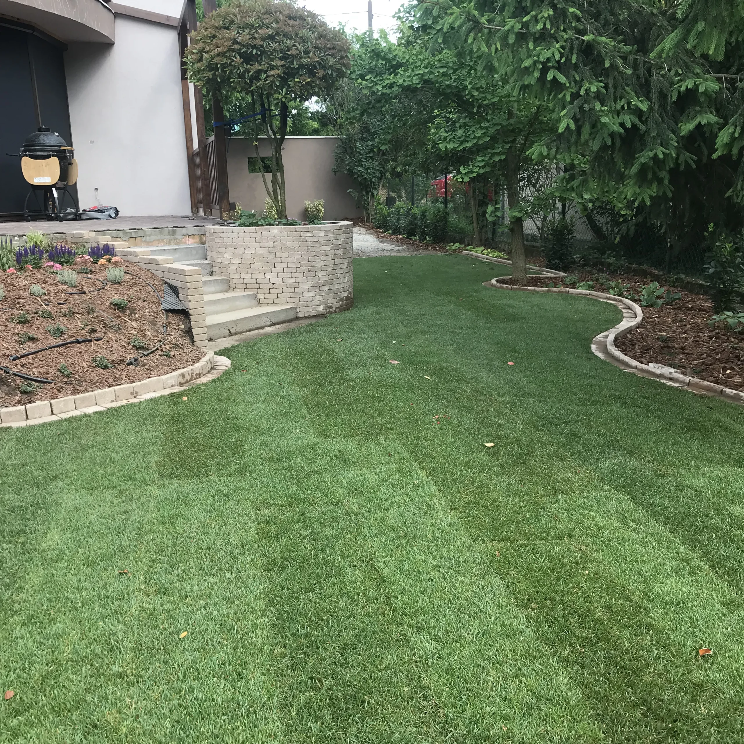 A kert gyepes területe gyepszőnyeg-terítéssel készült, így a munkálatok befejezése után azonnal puha, üde zöld felület fogadta a családot – ideális játszótér mezítlábas rohangáláshoz. A homokozó köré fenyőkéreggel borított virágágyás került, amely nemcsak esztétikus, de természetes módon segíti a gyommentességet és a talaj nedvességtartásának megőrzését is.