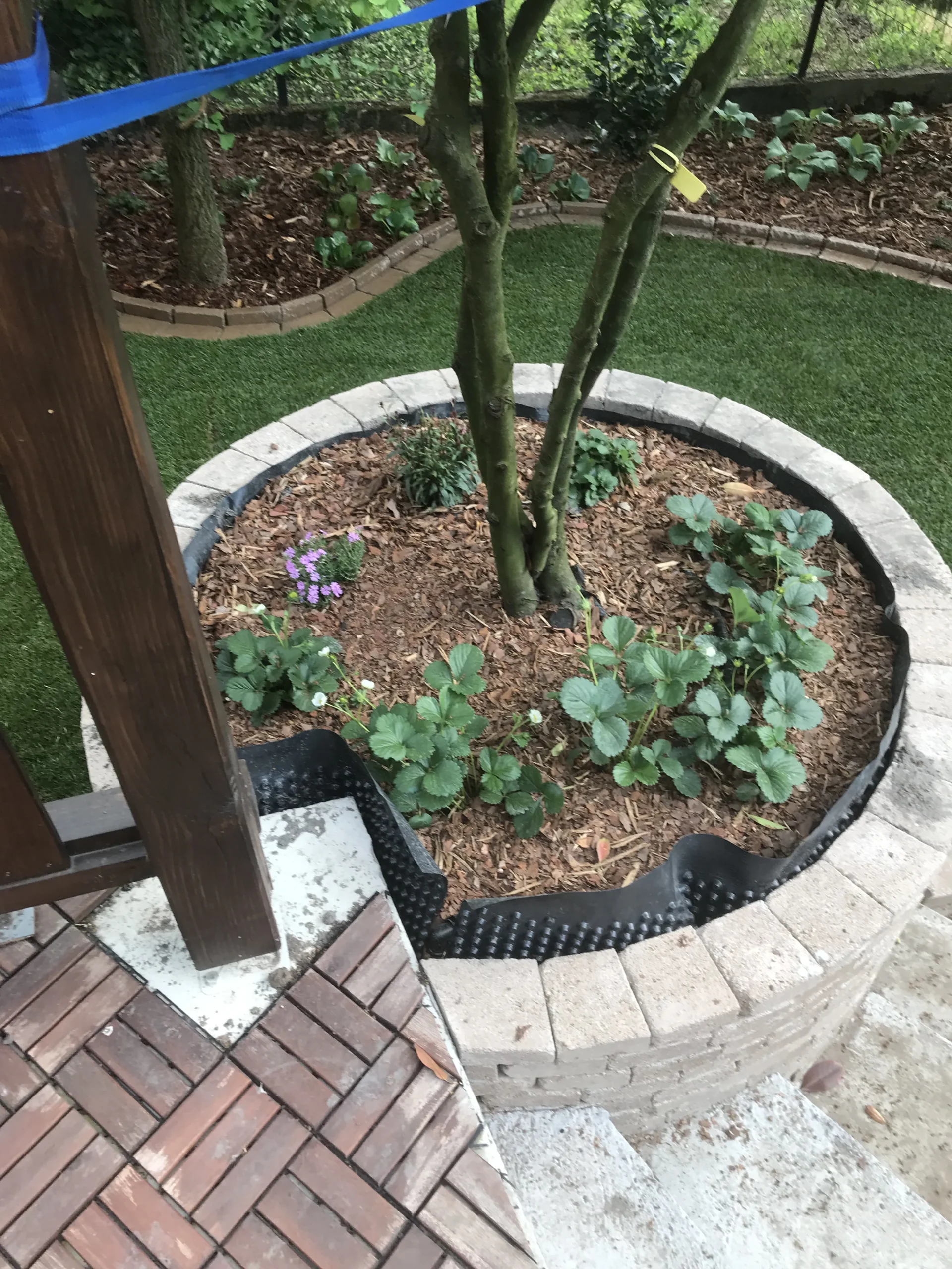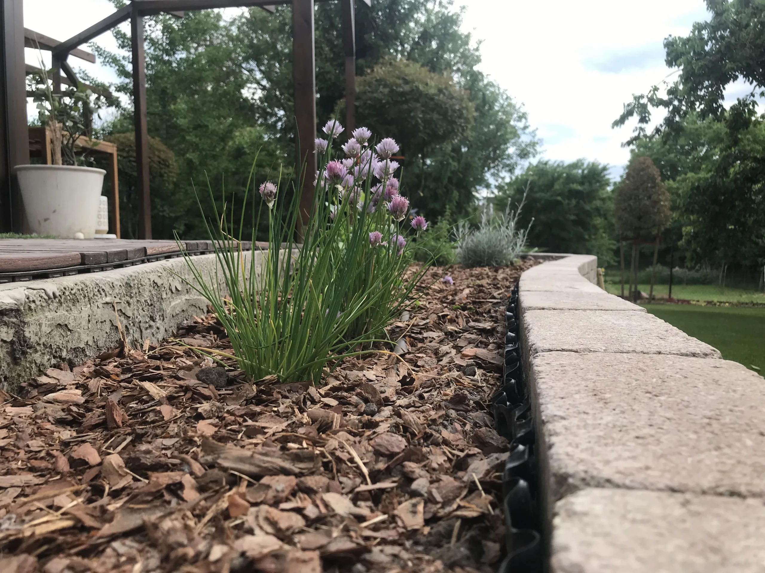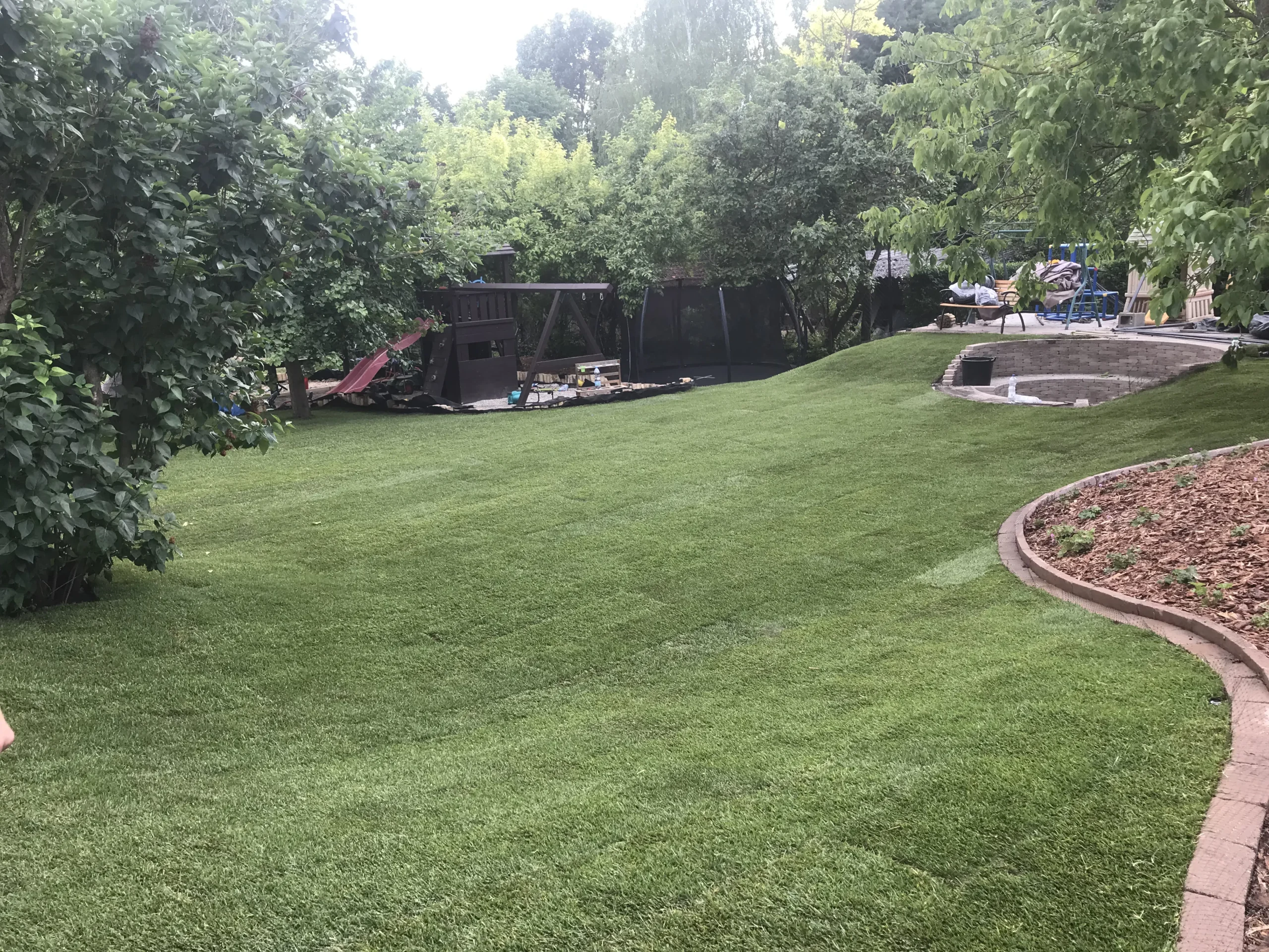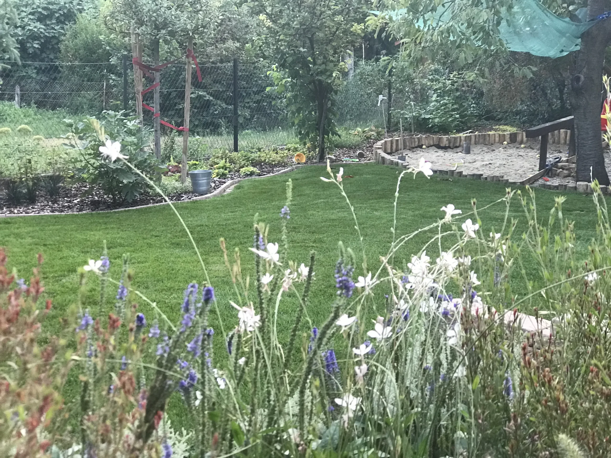 A kert gyepes területe gyepszőnyeg-terítéssel készült, így a munkálatok befejezése után azonnal puha, üde zöld felület fogadta a családot – ideális játszótér mezítlábas rohangáláshoz. A homokozó köré fenyőkéreggel borított virágágyás került, amely nemcsak esztétikus, de természetes módon segíti a gyommentességet és a talaj nedvességtartásának megőrzését is.